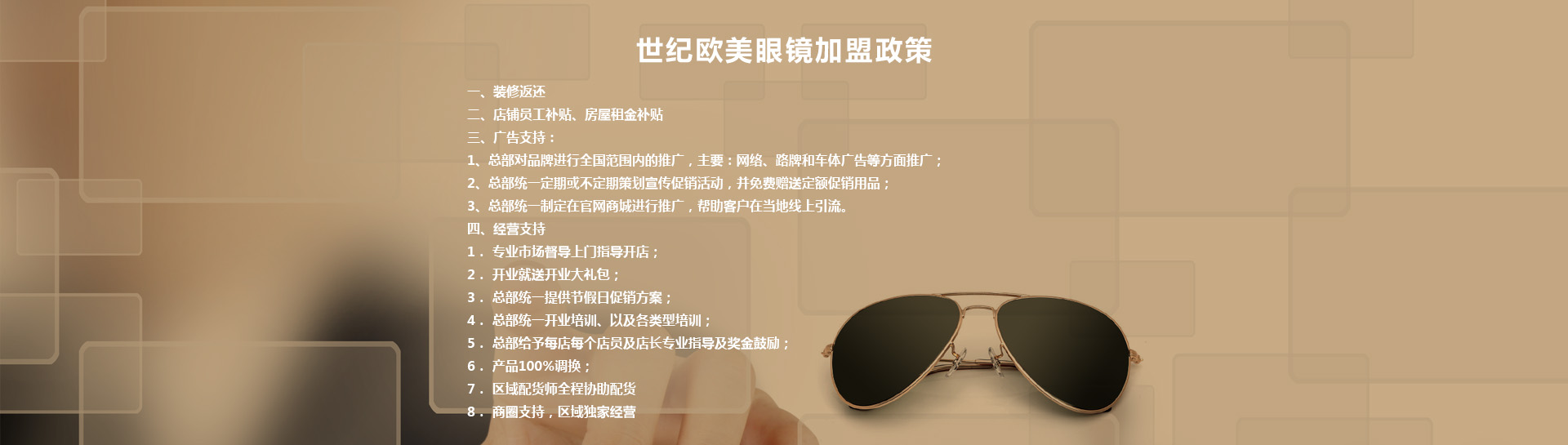 世纪欧美眼镜(国际)连锁眼镜有限公司(以下简称“世纪欧美”)是一家集科研、制造、营销、培训、服务、电子商务、连锁加盟为一体的大型专业眼镜连锁企业。公司集团分公司有地产、医药、医疗器械、装修公司等领域,已形成规模化发展。